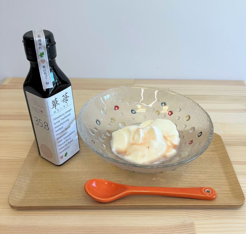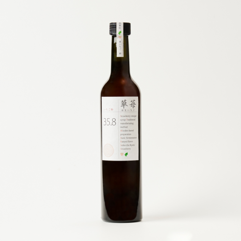 〇 いちごのまち。精華町(京都府)の若き生産者が大切に育て見立てた完熟苺を直接仕入れ、130年以上続く「お酢の蔵」でゆっくりと時間をかけて発酵。そうして出来た苺の果実酢に、種ごとすり潰した苺の果肉をそのまま加え、粗糖と蜂蜜(京都府精華町産)で味を整え、シロップの様な味わいに仕上げました。果汁や人工的な香料・甘味料は一切不使用ですから、健康志向の方々だけでなく、お子様にも安心して召し上がっていただけます。