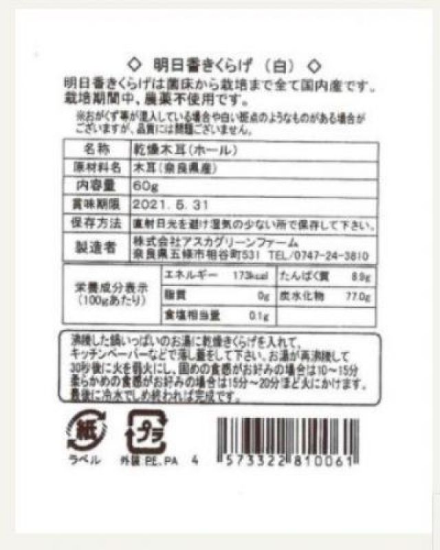 原材料:奈良県産きくらげ、内容量:60g