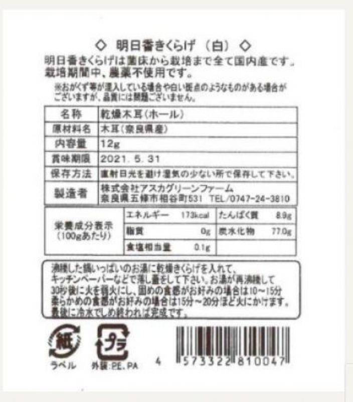 原材料:奈良県産きくらげ、内容量:12g