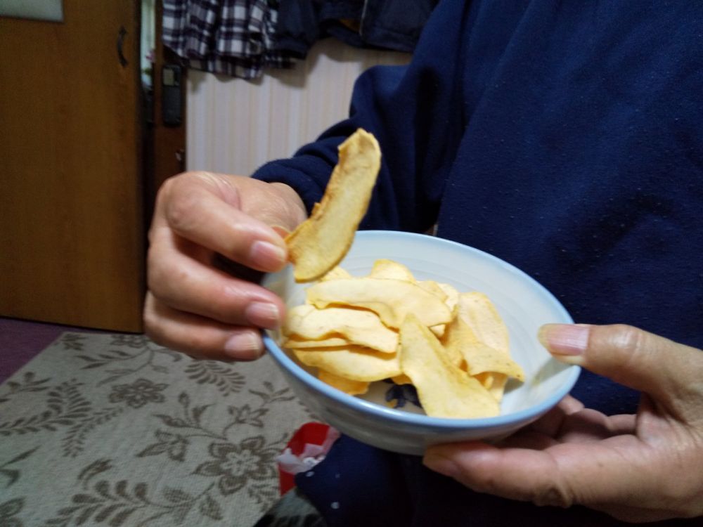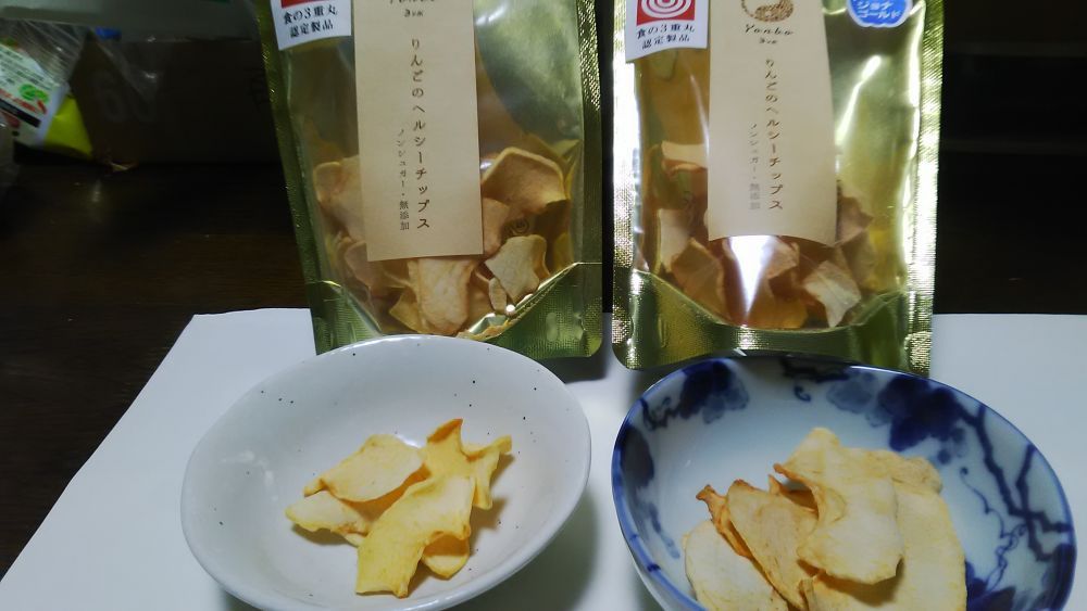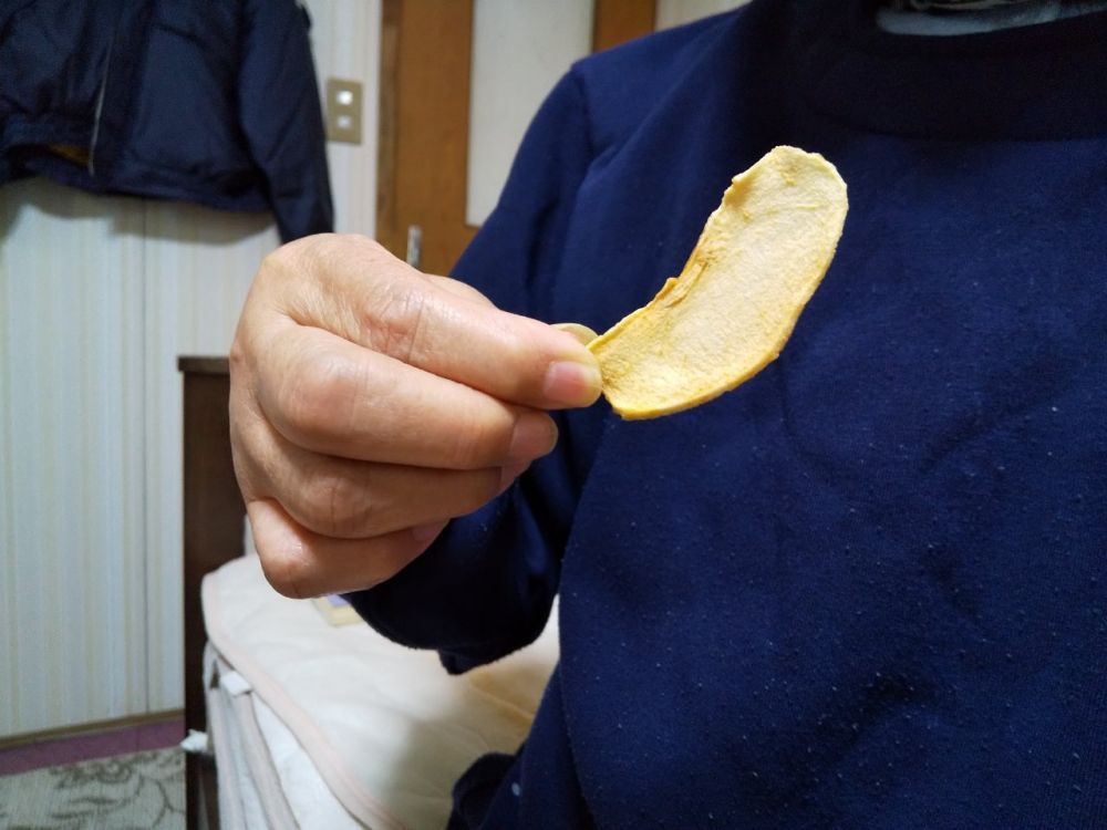 旬のりんごを乾燥チップスにしたこの商品は、パリパリしている薄いチップスもあれば、少し厚みがあり完全に乾燥してないソフトな食感のものも混じっていて、個人的には噛めばリンゴの甘味を感じる少し厚めのものの方が好みでした。食感は人によって好みが分かれると思いますので、現商品のように混じってるのもありだと思いますが、薄いチップスでパリパリのものと厚めのソフトタイプの食感のものと分けて販売されてても良いかなと思いました。