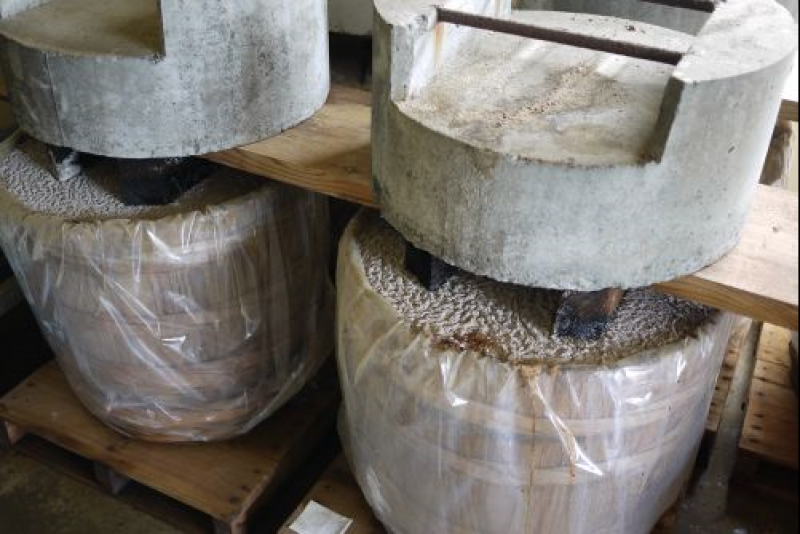 蒸した大豆を冷ましたのち、麹菌を付けます。その後塩水に浸して木樽に入れ、熟成させることおよそ1年。じっくりと時間をかけ、自然に任せてゆっくりと発酵が進んでいきます。約1年後、天日の下発酵した豆を広げて、天日干しをします。乾いたものと生姜をあえて完成となります。