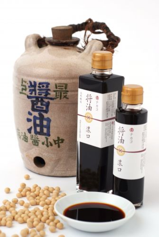 ナカコ天然ぽん酢に使われている醤油は、天然醸造二年熟成の無添加しょうゆです。標準的な濃口しょうゆよりも塩分が15%程度少なく、無濾過無調整の濃厚でまろやか味わいです。味の伸びがよく、特に熱が加わるとうまみが開くため、ぽん酢によく合う醤油です。