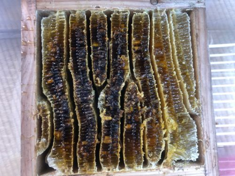 白い泡や黒い微細な蜜ろう片がみられることがあります。