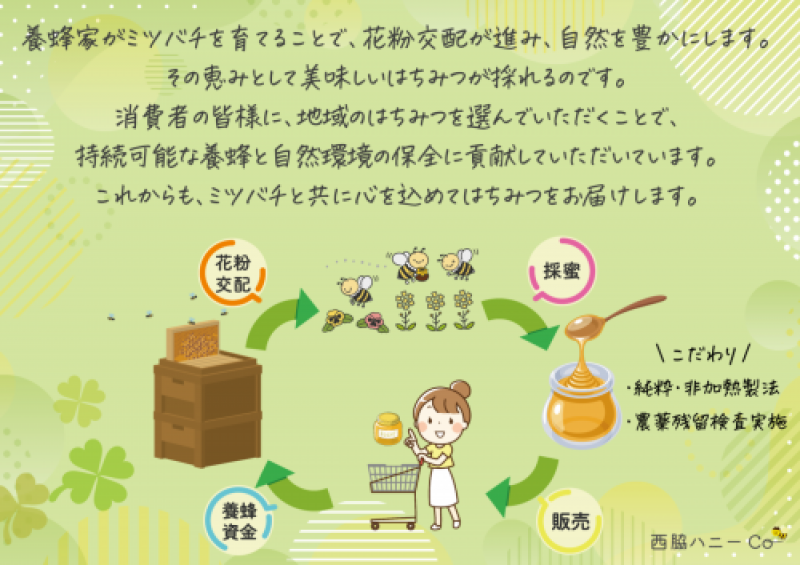 西脇ハニーCoは、はちみつの採取から瓶詰までを全て手作業で行っています。非加熱で純粋な風味を守り、自然の恵みをそのまま閉じ込めています。