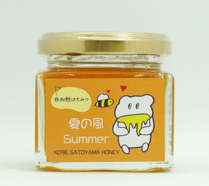 KOBE SATOYAMA HONEY の「夏の風」はアカメガシワ、トウネズミモチ、ヤブガラシ、カラスザンショウなどの日本の里山に昔からある草花から、ミツバチが集めた天然のはちみつです。はちみつの色は黄金色で、コクがありながら後味に柑橘が香るさわやかなはちみつです。