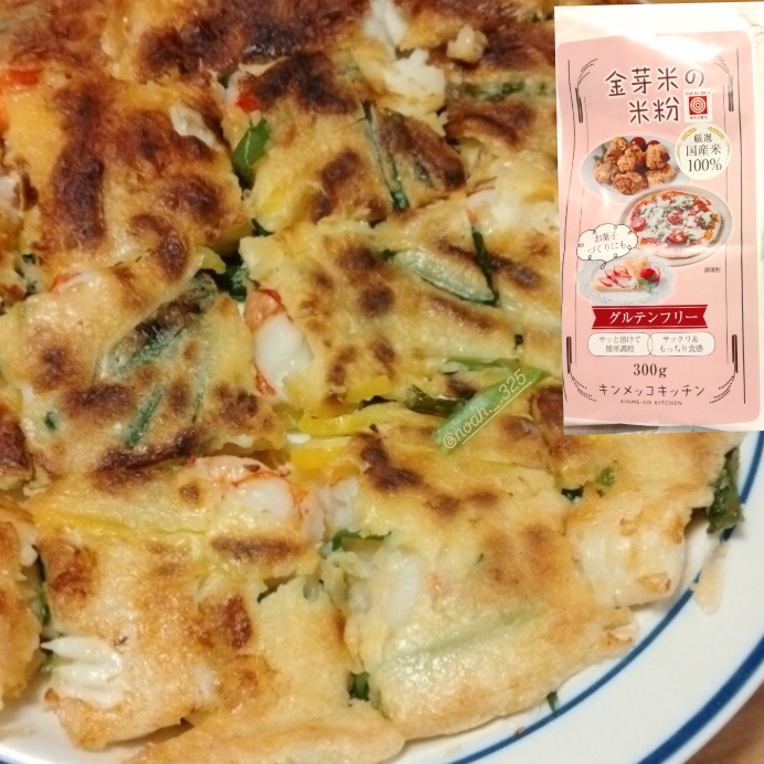 - シーフードチヂミを、『金芽米の米粉』で作ってみました。きめ細やかな粉で、水と混ぜる際も比較的簡単でした。