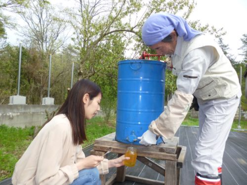 住谷さん、搾り器から出て来る蜂蜜の澄んだ色と豊かな香りにびっくりです!