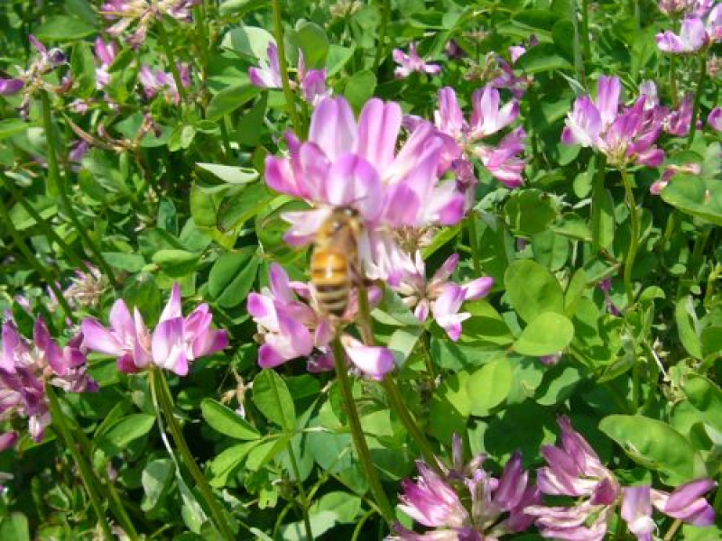 昨年の秋に蒔いた種からレンゲの花が咲きました。毎日様子を見に行っては、成長を楽しみにしていたのです。花にミツバチが群がっています、きっとうちの蜂たちでしょう。