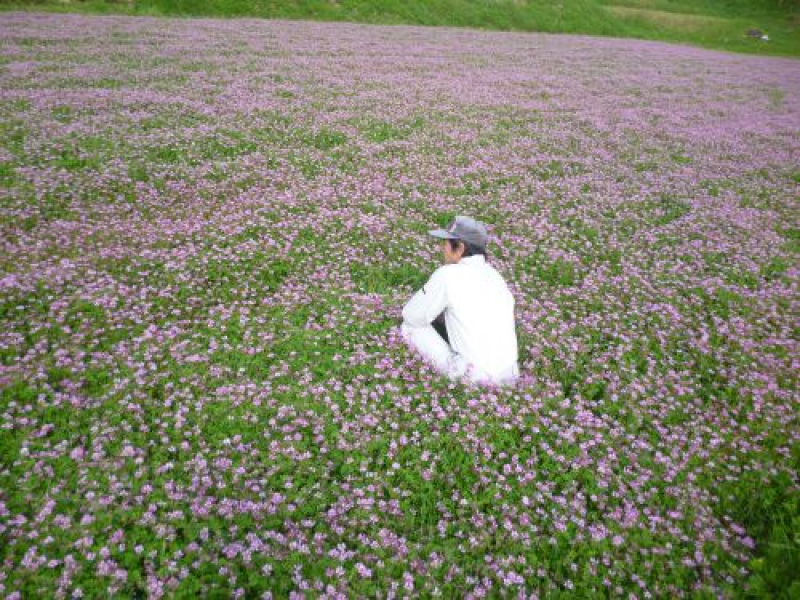 レンゲ畑が広がっています。満開のレンゲの中に座ると、小さいころ近所の子たちと畑の中で転げまわったり、花を摘んだりして遊んだことを懐かしく思い出します。