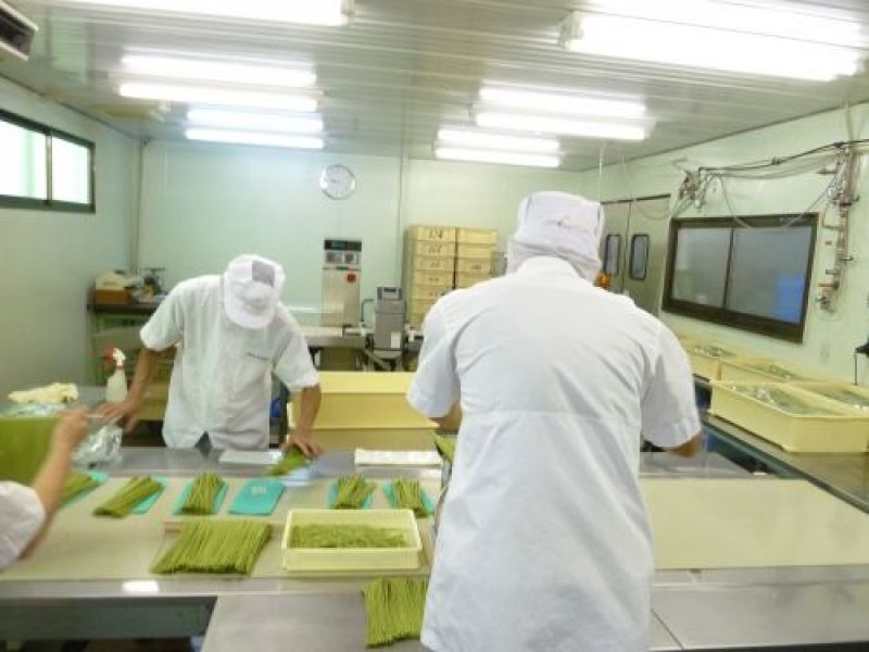 めん線として切り出し、加湿をしながらゆっくりと時間をかけて半乾燥した抹茶めんは粘りのある腰の強い麺に仕上がります。