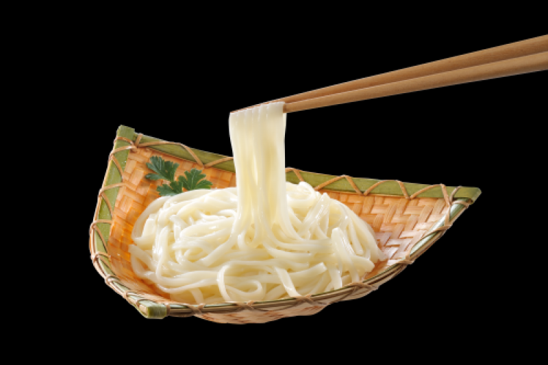 「早く茹で上がりかつ美味しいめん」多加水での製麺方法。これにより均一に茹で上がる、茹でどけのない角の立ったうどんが実現しました。