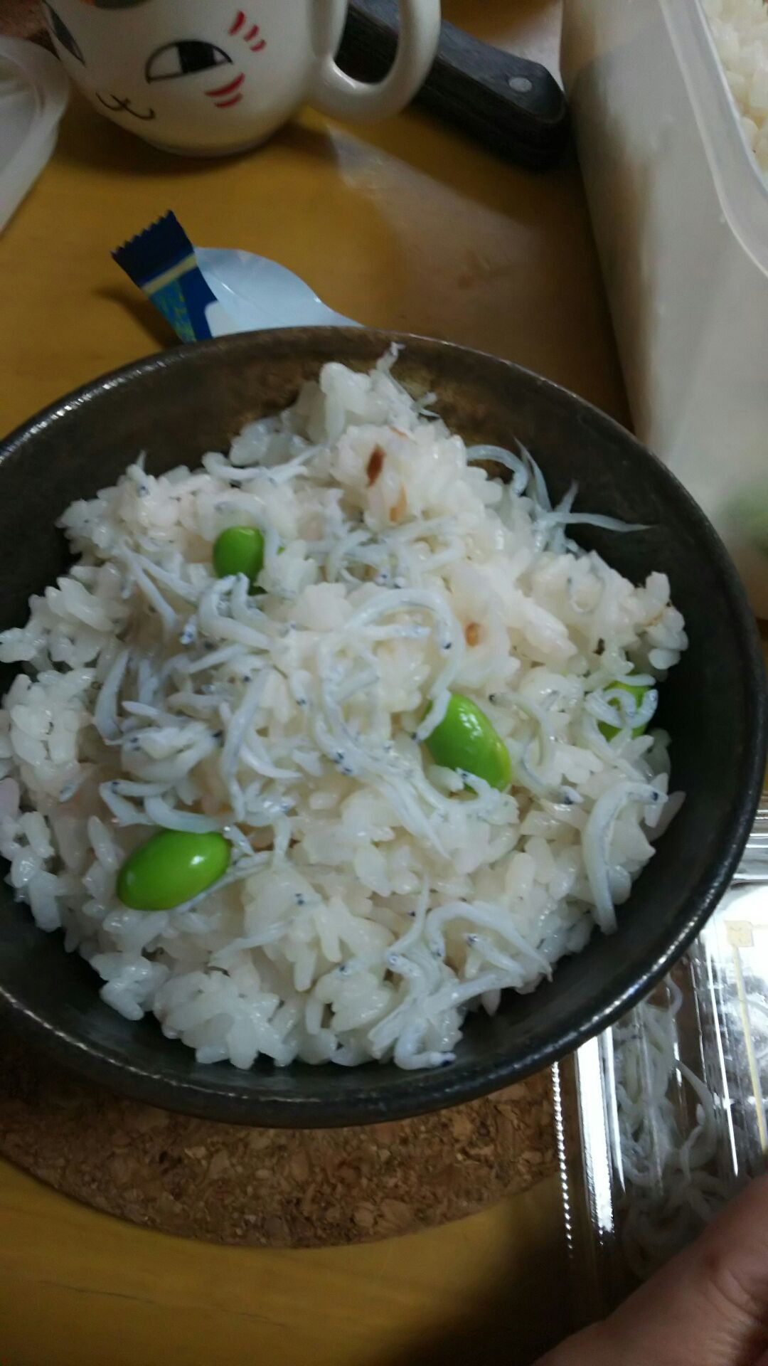 2個の梅干しを3合のお米と炊き込み、炊き上がってから種を除き、よく果肉を混ぜた後に、枝豆を混ぜ込み、シラスボシをトッピング。