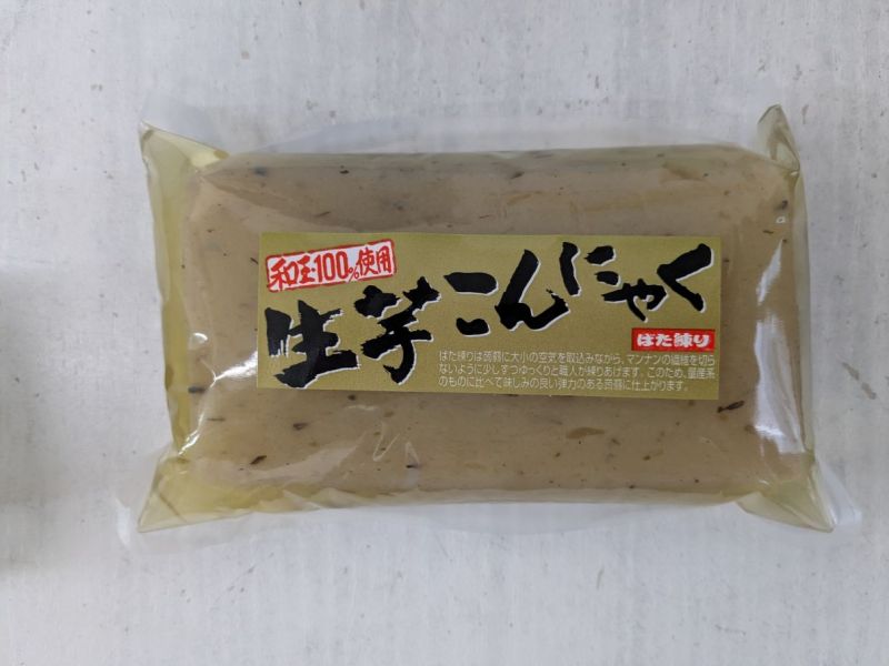 和玉と呼ばれる唯一の在来種(国内生産量0.7%(令和3年度時点))を100%使用した生芋板こんにゃく。生芋から作られたこんにゃくは、蒟蒻粉から作ったこんにゃくと比べて風味豊かで弾力があります。味染み抜群で、臭みもないのでそのまま生でもお召し上がり頂けます。