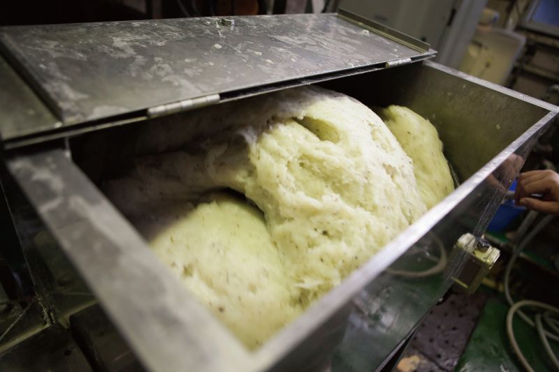 また大造製法は凝固剤を混ぜ合わしたこんにゃくを大きな型枠に流し込み固め、熟成後に約5㎏の塊に切り分けお湯の中に入れて煮上げていく製法。すべて手作業のため手間と時間がかかりますが、こんにゃくを直接お湯につけて煮上げるため十分なあく抜きができ、蒟蒻独特の臭いが少ない蒟蒻に仕上がります。