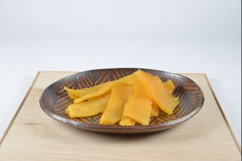伊豆食文化公園の自社農場で栽培、収穫した紅はるかを使用。貯蔵・追熟させて甘みを増したさつまいもを自家製の大きな薪窯でゆっくり、じっくり茹でながら加熱。今ではめずらしい、昔ながらの煮切干しという作り方で丁寧に丁寧に作りました。柔らかくもっちりした食感とたっぷりの甘みは、他の干し芋とはひと味違います。