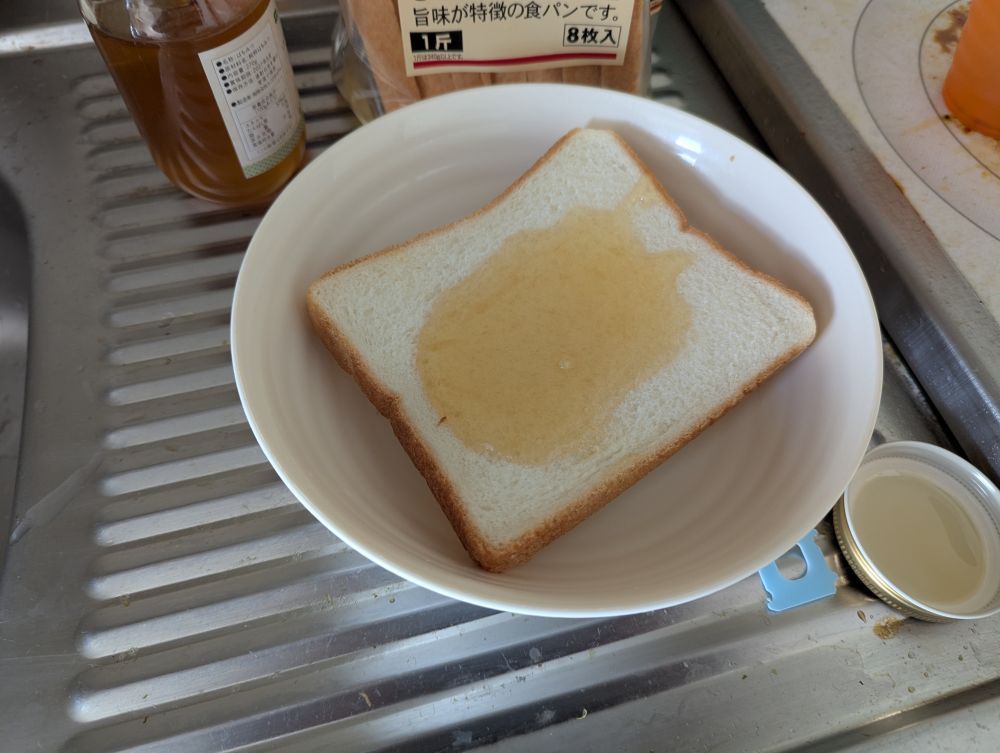 食パンに、黄金色の蜂蜜をたっぷりと回しかけました。蜂蜜がパンの窪みにじゅわっと染み込んでいく様子は、まさに至福の光景です。