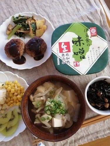 夕食で伊豆食の味噌を使用して味噌汁と豚ひき肉&じゃがいもの味噌炒めを作りました!