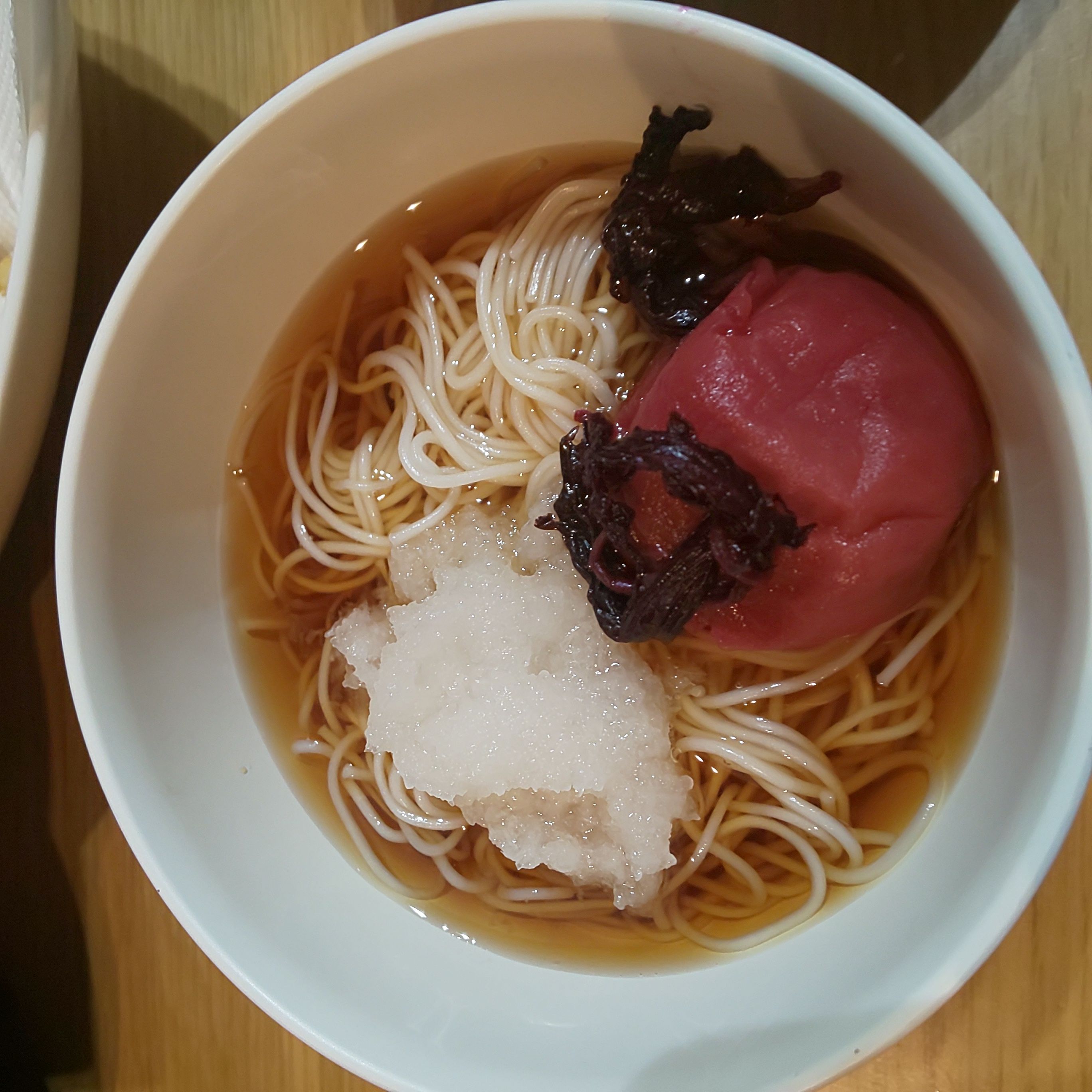 かなり塩分が強いので、お素麺のつゆをうすくして梅の塩分でいただきました。