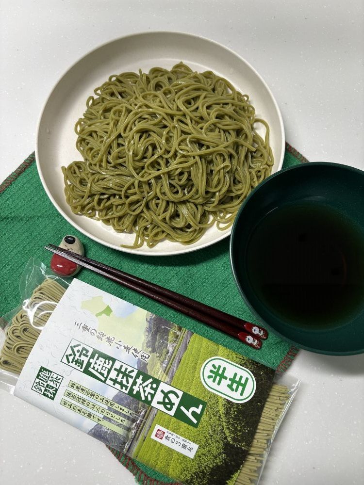 封を開けた際にお茶の香り、ゆでている時にもお茶の香りがし、心地良いです。そして、麺の色味もキレイで梅雨時期に気持ちが明るくなります。