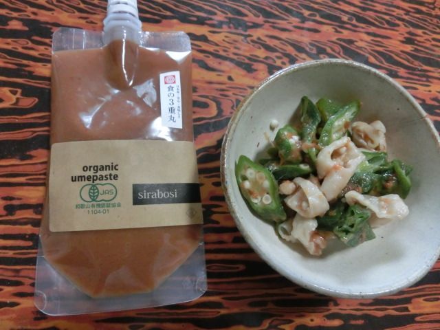 今回は、旬のオクラと鶏皮の梅肉和えを作りました。オクラと鶏皮を茹で、オクラは輪切り、鶏皮は太めの千切りにして、本品に削り節と少量の日本酒を加えて和えてみました。さっぱりとした味でとてもおいしく仕上がりました。夏は特に爽やかな梅の酸味が合います。いろいろな具材で楽しみたいです。(試食モニター)