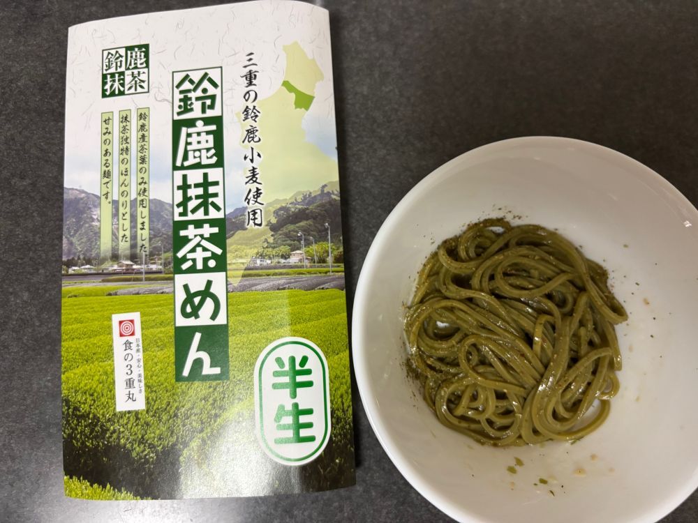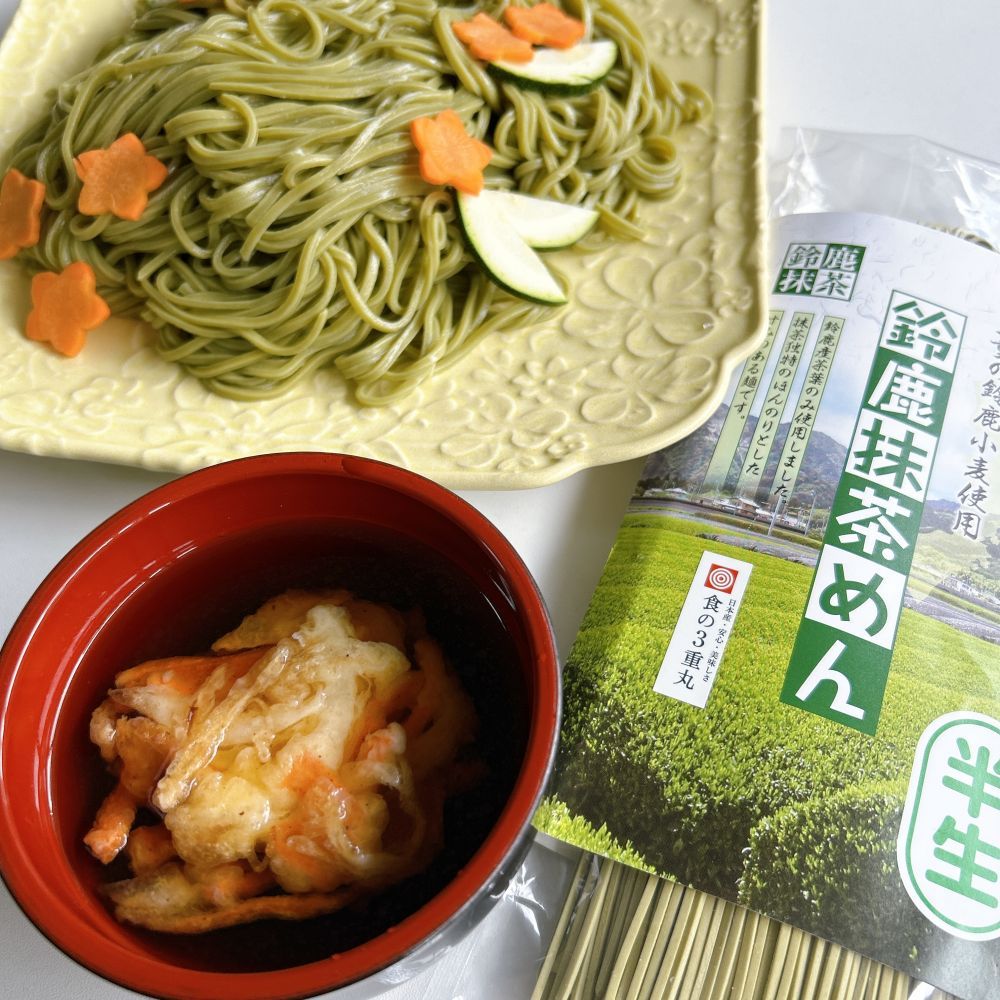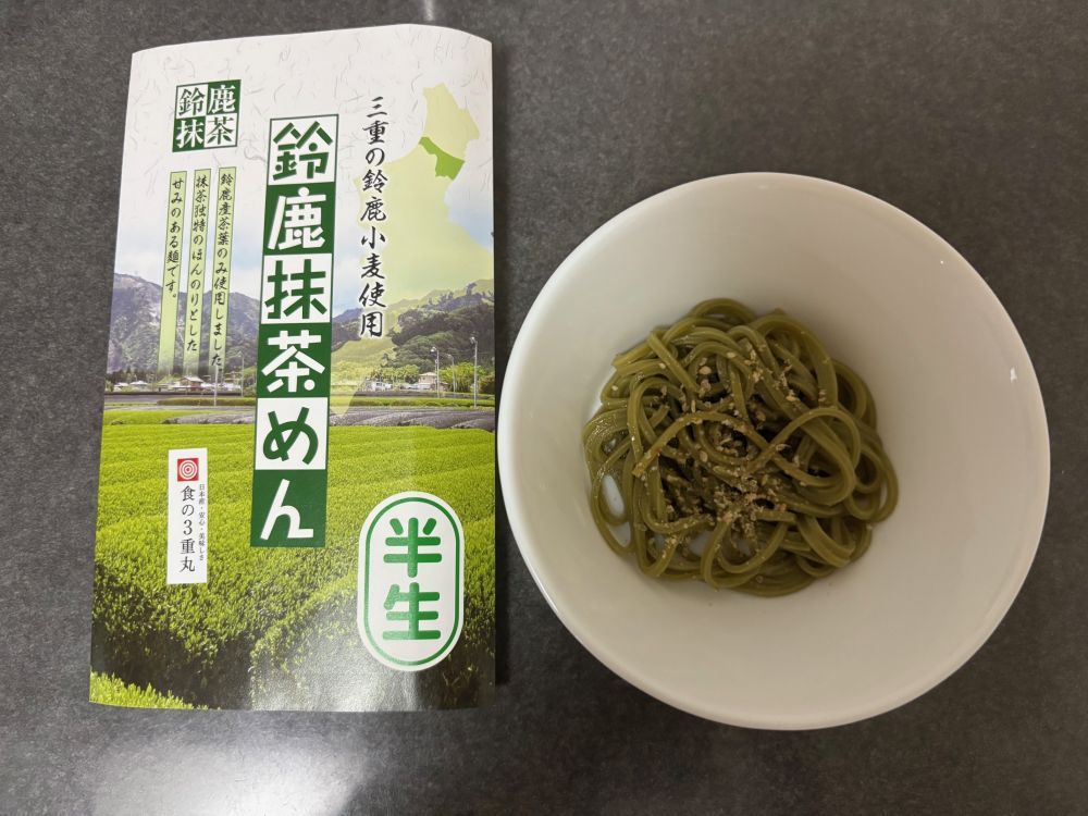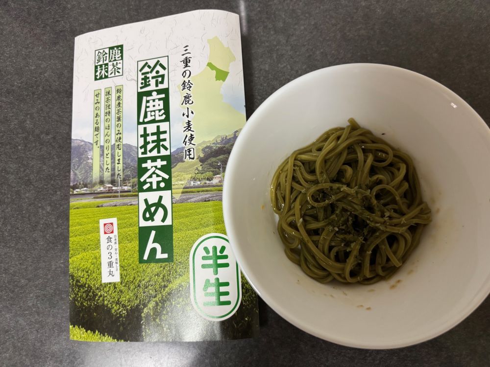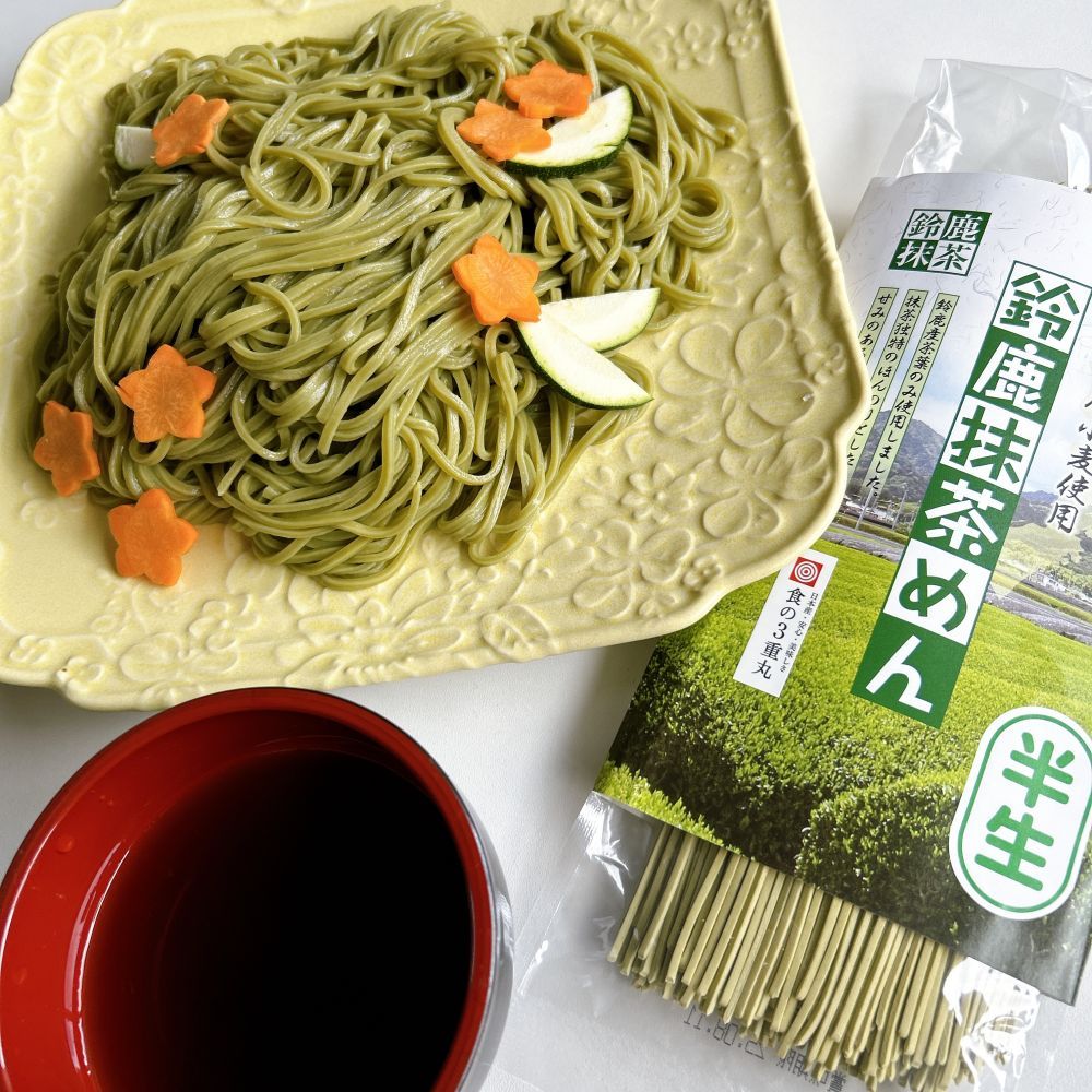綺麗な緑色のめんは、見た目も美しく、香りも爽やかですね。「半生」ということで茹で時間も短く、この時期にはとってもオススメです。めん自体はモチっとした食感でひやむぎより太く、うどんより細いといった感じですが、食べやすい太さで非常によかったです。お茶は三重県鈴鹿のお茶、小麦も三重県の物を使用とのことで日本の地方の食文化を味わえた気分になり、とても嬉しかったです。