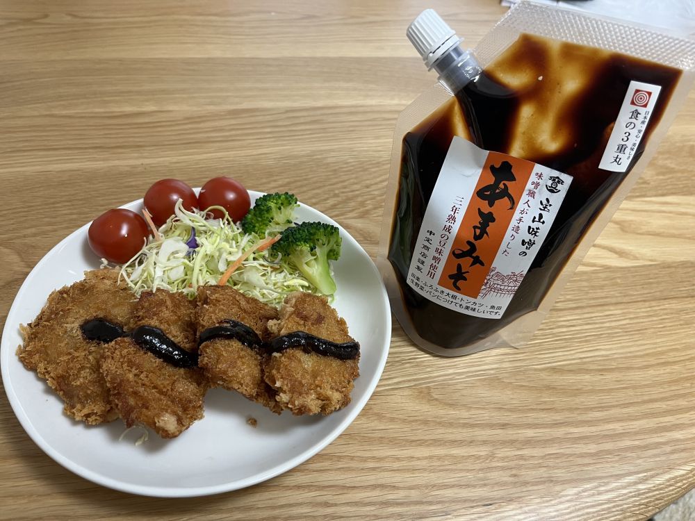 「この、あまみそめちゃくちゃ美味しい!甘さとコクが絶妙で、揚げ物との相性が抜群。今回、ヒレカツにかけてみたけど、濃厚なのにくどくなく、しっかり味が染みてめっちゃ満足。キャベツとも相性よくて、ついつい食べすぎてしまう...!パウチタイプで使いやすいのもポイント高い。味噌カツ好きにはたまらん逸品!」