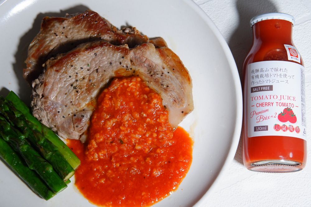トマトジュース➕塩麹➕レモン汁を煮詰めてお肉のソースにするとどれも新しい美味しさに出会えます。