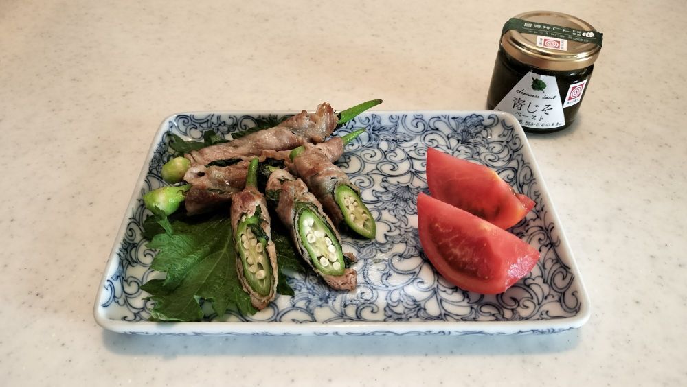 豚肉に青じそを乗せてペーストを塗り、丸オクラを巻いてオリーブ油で焼いてみました。最初に舐めてみたところかなり塩分が強かったので、お肉に塩は振らずペーストだけで味付けました。