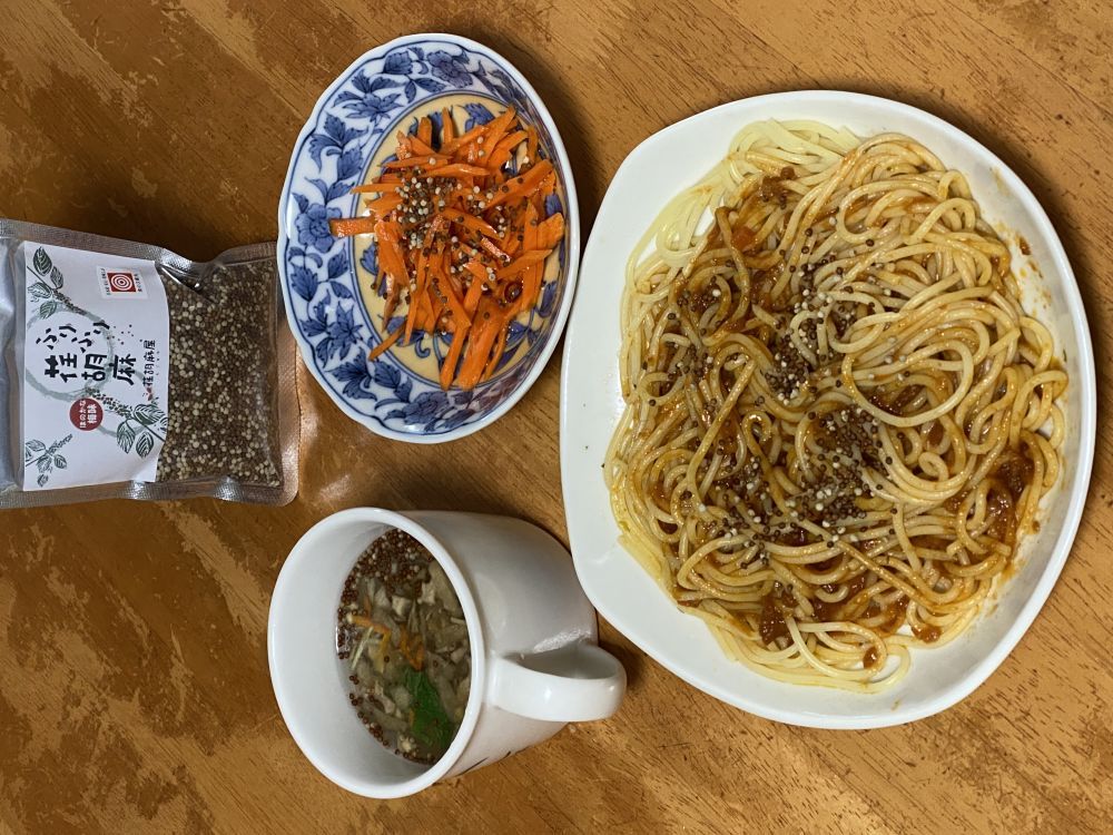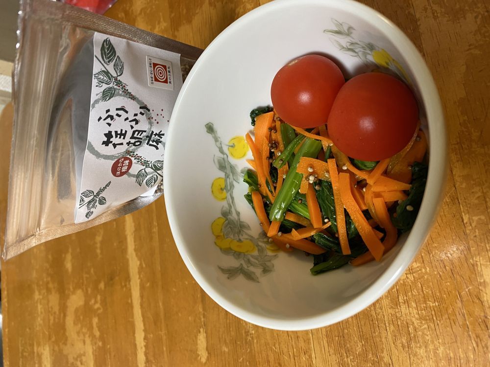 ミートソースパスタ、野菜スープ、にんじんマリネ、青菜のお浸しなどにかけてみました。