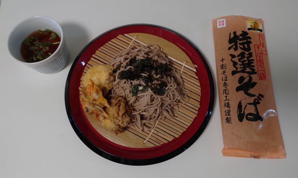 早速在宅勤務のランチでいただきました。寒いし、温かいおそばに…とも思いましたか、天ぷらを添えてざる蕎麦で食べたところ、十割そばの風味や食感が際立ち、大正解でした。