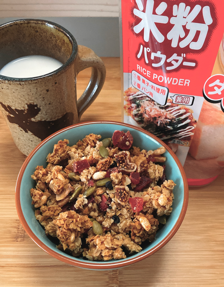さらさらと細かい粒子でダマにならない米粉です。山形に住んでいるので「彩のかがやき」と言うお米の米粉をはじめて知りましたが、溶けるように混ざりやすく扱いやすくてよかったです。米粉を使用するお菓子や料理はいろいろあると思うのですが、今回は米粉のグラノーラを作ってみました。油も米油を使用し、栄養価も良いと思うのですが、消化にもよくて朝食などはもちろんですが、美味しいのでおやつにもポリポリ食べてしまい美味しかったです。