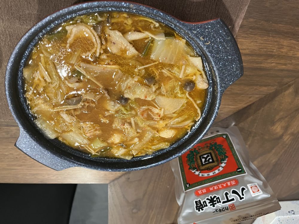 キムチ鍋だけだと辛さだけを強く感じるのですが、お味噌が入る事で辛さの奥に柔らかな口当たり。まろやかになって美味しく仕上がりました。