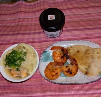 今回は亜麻仁醤油麹N503 を使って三品作りました。酒粕と亜麻仁醤油麹N503 を合わせたペーストに殻付き海老とかじきまぐろを一晩漬け込みグリルしたもの、同じペーストに殻を外した海老を一晩漬け込み、それを下味をつけた生の鶏団子でくるんだものを餃子の皮が敷いてあるココット型に入れ、上から餃子の皮でふたをした簡易小籠包です。