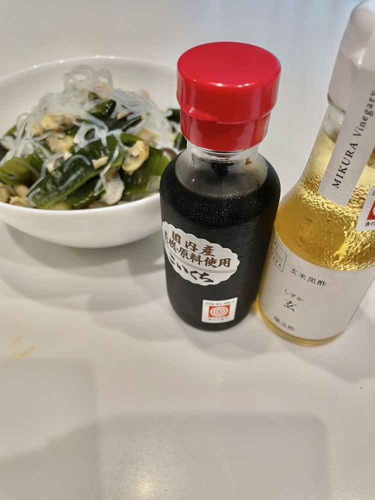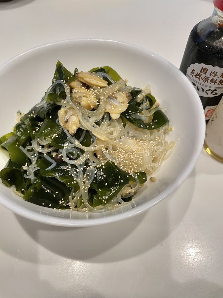 わかめ、糸こん、あさりを使い、玄米黒酢と有機醤油、アガベシロップを使って少しだけ加熱してタレにして和えました。朝ごはんにピッタリな一品が仕上がりました。