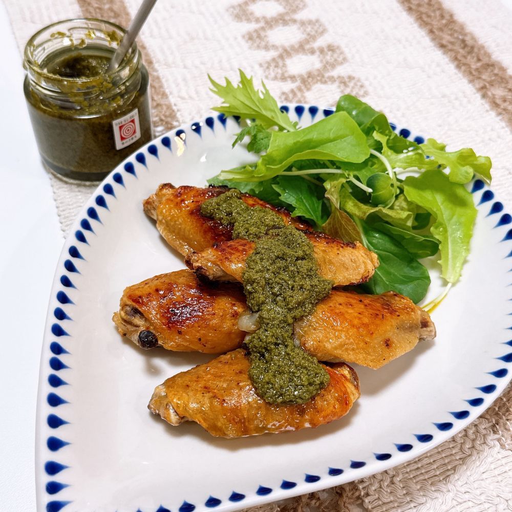 手羽先にバジルペーストをたっぷりかけて食べてみたら、想像以上に美味しかったです。香ばしく焼いたチキンと、バジルの爽やかな香りとコクが絶妙に合っていて、つい手が止まりませんでした。シンプルなのに贅沢な味わいで、常備したくなる一品です。