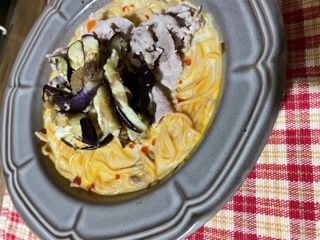 豆乳と豆板醤の冷たいスープに具材は豚バラとナスをのせて、ピリ辛のそうめんに仕上げました!スタミナを付けることができて、冷たいのでつるっと食べることができました!
