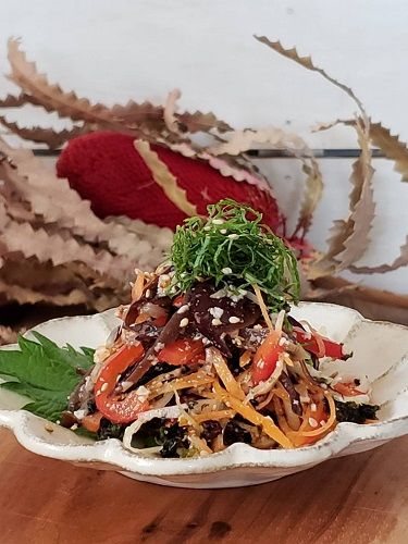 セロリ・パプリカ・人参・大葉・きくらげを千切りにして